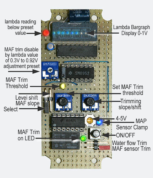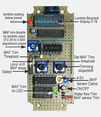 1) Build into a box about 100mm x 50mm x 25mm 2) Upon switching on (manual switch) the MAF signal go through a number of modifications. 3) The "start trimming voltage" reaches a user preset voltage (~3-5V) 4) Once the voltage is reached, the MAF voltage will start slopping downwards (less upwards). 5) The "amount" of slope is user adjustable, limited to ~20%. 6) A 0-1V Bargraph display monitor the lambda value. (splice into the existing sensor). It is not perfect but you should see rich or lean. 7) An electronic level should be included to disable the "MAF trim" should lambda fall below a preset voltage - some where between 0.4-1.0v. 8) If the lambda falls below the preset level, it will turn off the Map trim. 9) System can be triggered by the 1s's manifold pressure switch 10) System also can be triggered by the a ground signal (opposite to 1s) |