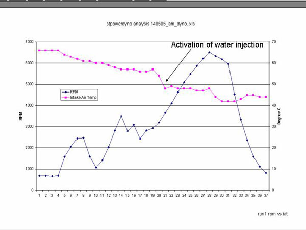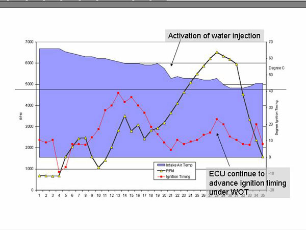 the graphs were recorded during a dyno run; ambient temp was 32 degrees C, humidity 85% See the inlet air temperature drop when water cuts in... ![]() The ECU is able to alter ignition timing in present of WI... ![]() More installation inofrmation, nice illrustrated images... ![]() ![]()