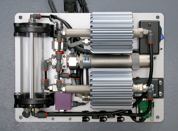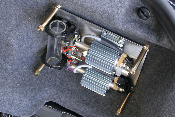 The transparent tube worked is air-trap/accumulator, it allows the water to accumulate before entering the water pump. It was designed to be used as follows: 1) Water comes in from the main tank from the bottom and go out into the two pumps inlets. 2) The top venting port goes to the top of the main water tank but is closed-off by a simple on/off solenoid valve (the purple item). 3) When the two pumps demand water from the tube, water from the main tank will automatically refill the tube due to vacuum created by the water displacement. 4) This will continue to work in the same vain provided there are no air delivered from the main tank. It is unlikely anyway because the the float switch (black leaded item) is situated at a level of about 1/4 full. Beyond that, no more water injection - a yellow warning lamp will illuminate on the dash. 5) In the unlikely event of air being develivered, the air will go towards the top of the tube thus preventing air being drawned into the pumps. 6) When injection stops, the controller will open the simple valve for a few seconds so that air (if any) will be vented via the top port into the top of the tank. This action is immediately cancelled when main injection re-commences . The system was designed to be completely maintenance free so the end user will only need to filled the water tank to re-start the system. If the system is used on a turboed, the "tank empty" signal can lower boost. ![]()