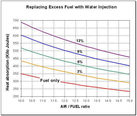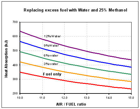 I'd better explain how the chart was calculated: Without water: 10Kg air + 0.95kg fuel = 10.5 afr . . . 10Kg air + 0.80kg fuel - 12.5 afr With water 10kg air + 0.95kg fuel + 0.00475kg = 10.5 afr + 5% wfr . . . 10kg air + 0.95kg fuel + 0.095kg = 10.5 afr + 10% wfr Substitude the latent heat of each liquid and plot the result with excel. Latent heat of fuel = 350KJ/kg Latent heat of Methanol = 1109 Kg/kJ Latent heat of water 2256KJ/kg